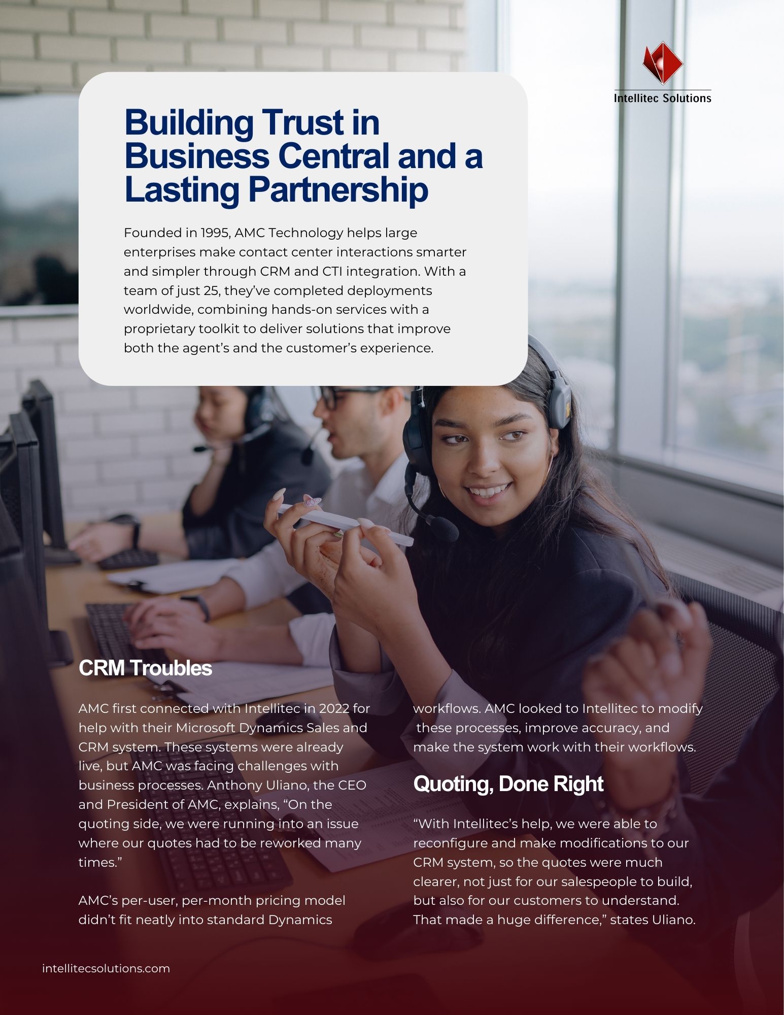 AMC first connected with Intellitec in 2022 for help with their Microsoft Dynamics Sales and CRM system. These systems were already live, but AMC was facing challenges with business processes. Anthony Uliano, the CEO and President of AMC, explains, “On the quoting side, we were running into an issue where our quotes had to be reworked many times.”